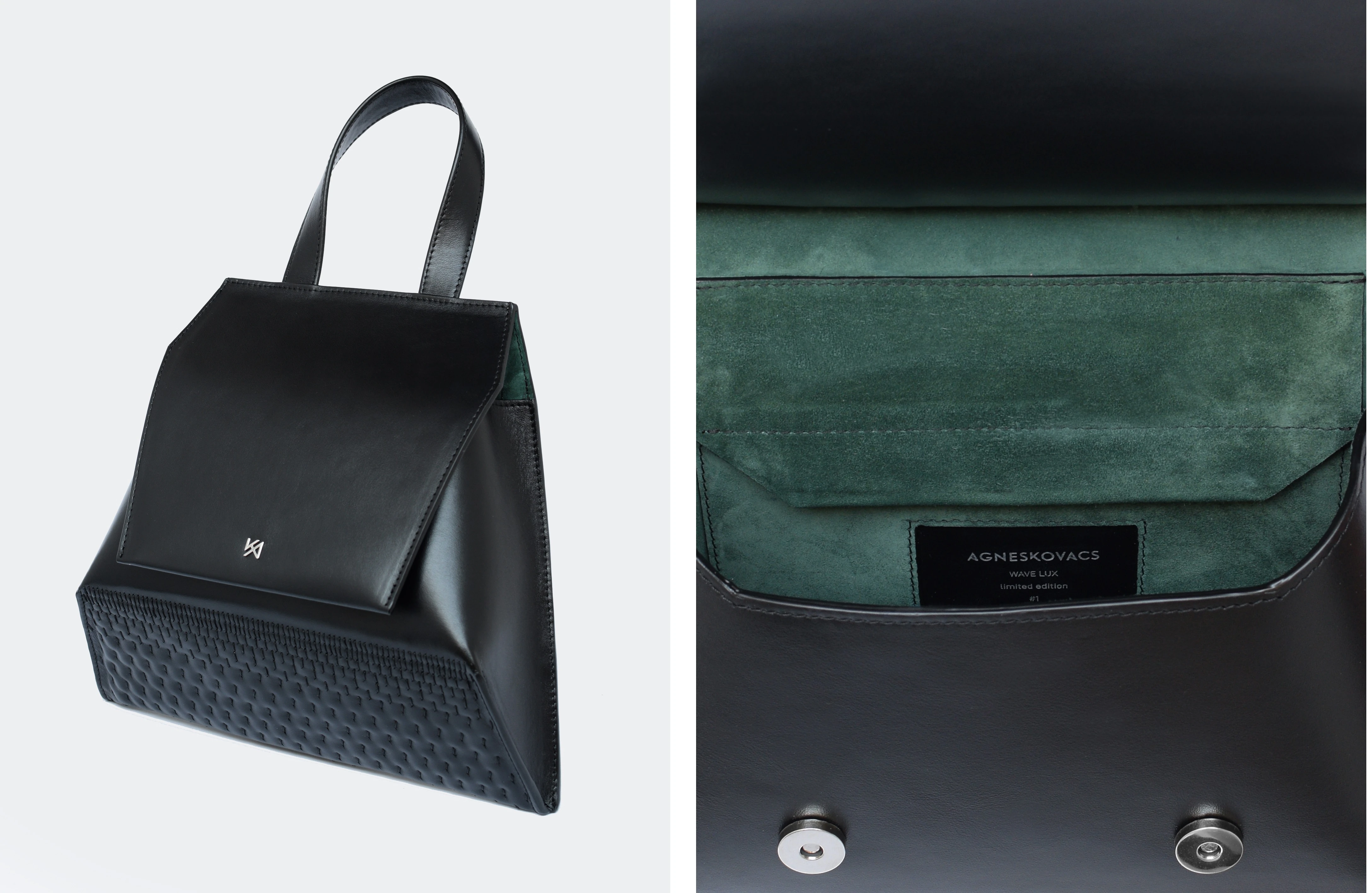 „Az AGNESKOVACS esztétikája minden felesleges részlet elhagyásával, a funkció által vezérelt formák friss egyszerűségében valósul meg. A táskák jellegzetes karakterét az egyedi kialakítási technika adja; minden esetben egyetlen lapból, hajlítások és hajtások váltakozásával készül el a varrással rögzített végső forma” – olvashatod a magyar tervezőnő kollekciójának bemutatását a Facebook oldalán. És valóban, Wave táska-kollekciójának legújabb darabjában is a legmegragadóbb az a letisztult elegancia, amely csak egy kézzel készített, egyedi táskának a sajátja.