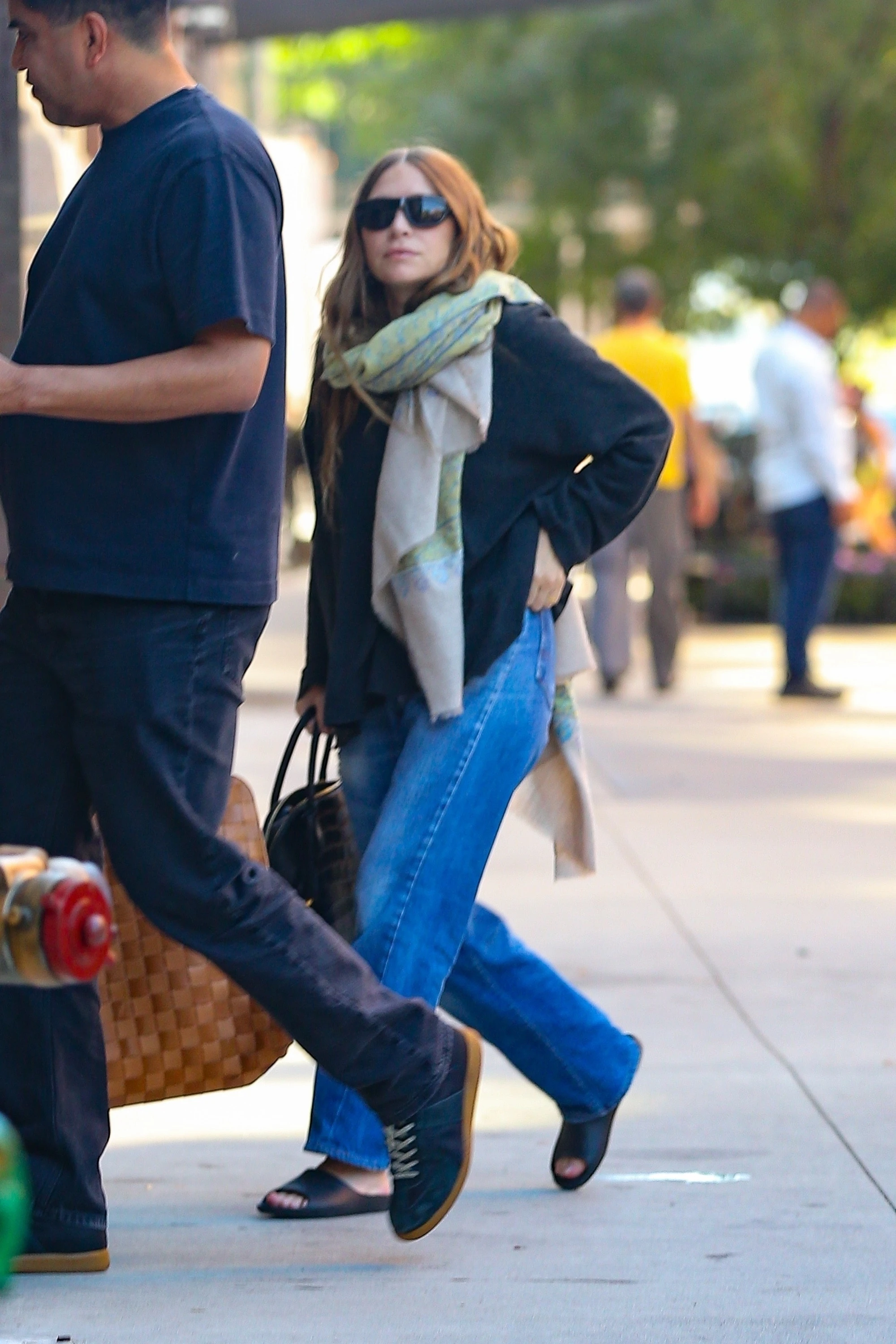 Ashley Olsen egy kényelmes Ama Slides papucsot, hozzá pedig bőszárú, kék farmert és egy túlméretezett (ez mostanra a védjegyévé vált a The Row nevű márkát alapító testvérpárnak) fekete inget viselt.