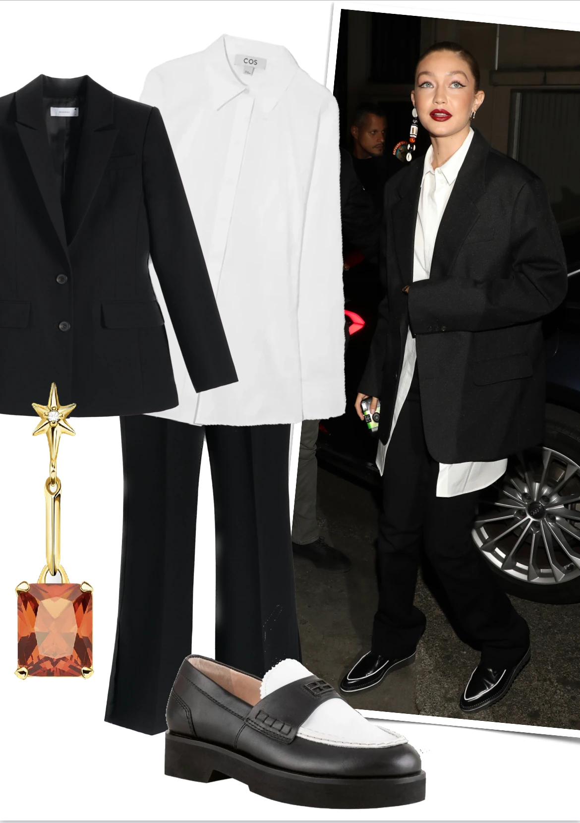 Ellensúlyozd ezt a fiús stílust Gigi Hadid módra egy eltúlzott méretű, látványos fülbevalóval vagy egyéb nőies kiegészítővel. A blézernél hosszabb ing kicsit lazít a hivatalos, fiús stíluson.