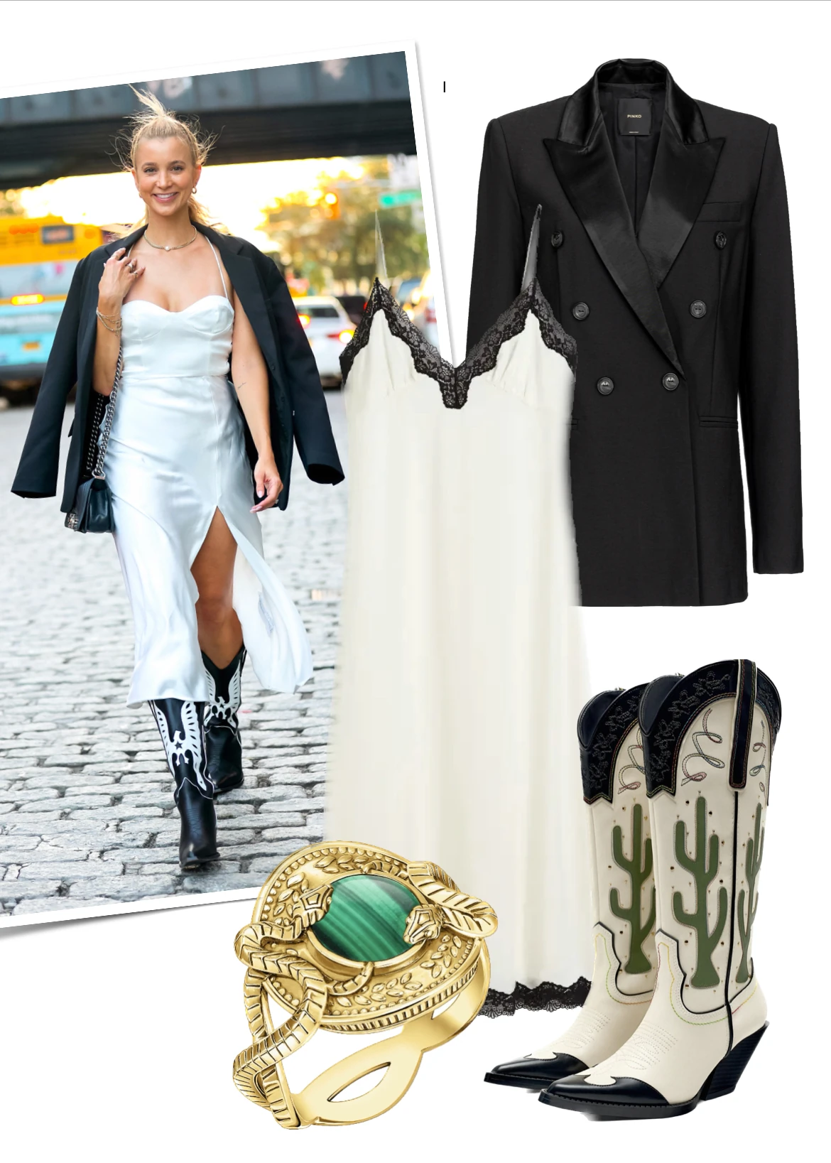 Ez az a klasszikus színkombináció ami sosem megy ki a divatból. Sabina Gadecki egy rafinált csavarral stílusosan ötvözi a budoárban viselt szexi kombinéruhát a vadnyugatot idéző westerncsizmával.