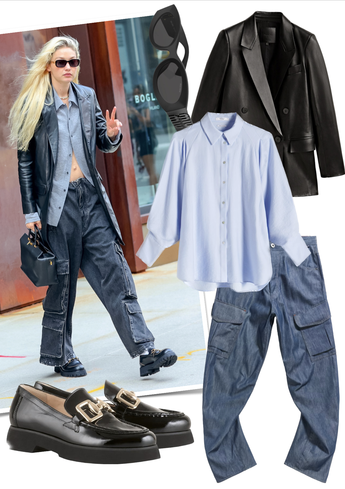Ellensúlyozd ezt a fiús stílust Gigi Hadid módra egy eltúlzott méretű, látványos fülbevalóval vagy egyéb nőies kiegészítővel. A blézernél hosszabb ing kicsit lazít a hivatalos, fiús stíluson.