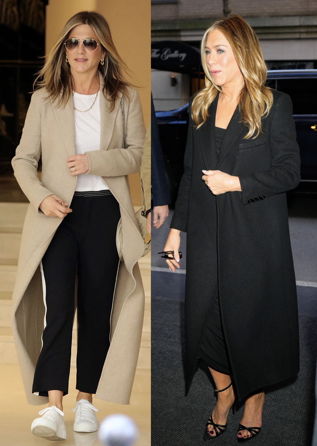 Ezt az alapfazont is előszeretettel hordja alapszínekben. Fekete és bézs változat, ami szintén mindenhez megy, és bármikor viselhető. Könnyen formázható, ahogy a színésznő is minden alkalommal bemutatja a legjobb oldalát a hosszú kabátnak.