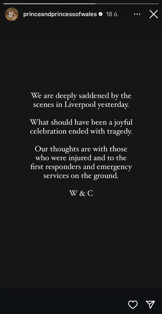 Katalin hercegné és férje, Vilmos herceg, valamint Károly király és Kamilla királyné megható üzenetek formájában fejezték ki együttérzésüket a hét eleji liverpooli tragédia kapcsán - írja a HELLO. A hét elején egy autó a futballcsapat Premier League győzelmét ünneplő parádéja közben a tömegbe hajtott, a merénylő több gyalogost elgázolt, a tragédia összesen 47 ember sérüléséhez vezetett. A királyi család tagjai azonnal reagáltak az esetre, és közösségi oldalaikon osztották meg szívszorító üzeneteiket, támogatásukról biztosítva az érintetteket.