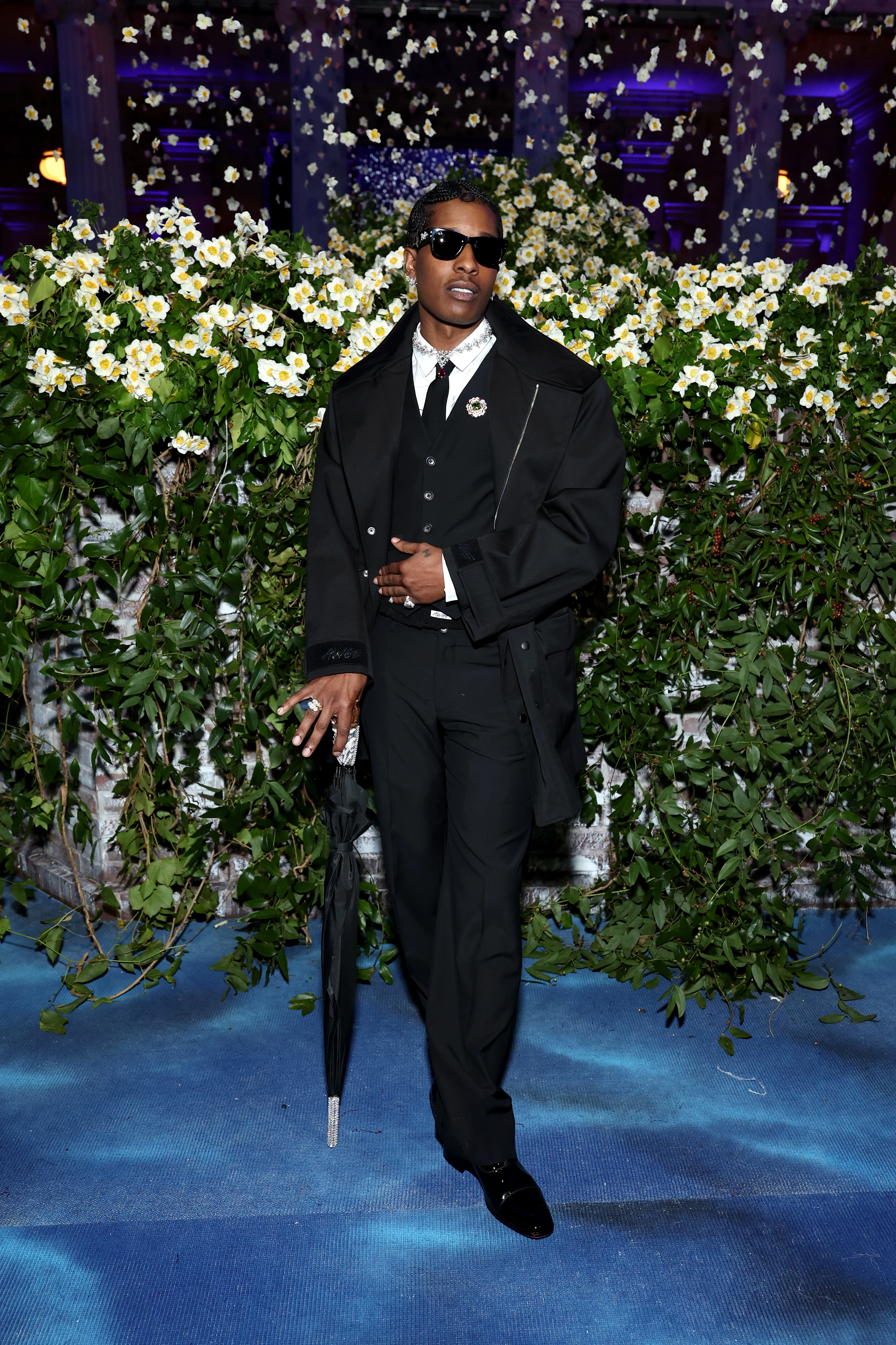 Klasszikus fekete öltönyben, Marmot dzsekiben és számos csillogó kiegészítőben, köztük egy Briony Raymond által készített, 90 karátos gyémántokkal kirakott esernyőben vonult végig. Szakértő módon ötvözte a sportruházatot a dress code mögött álló fekete dandy ihletésű ruhákkal. Rocky a Vogue-nak azt is elmondta, hogy harlemi fiatalságából merített ihletet a megjelenés megvalósításakor.