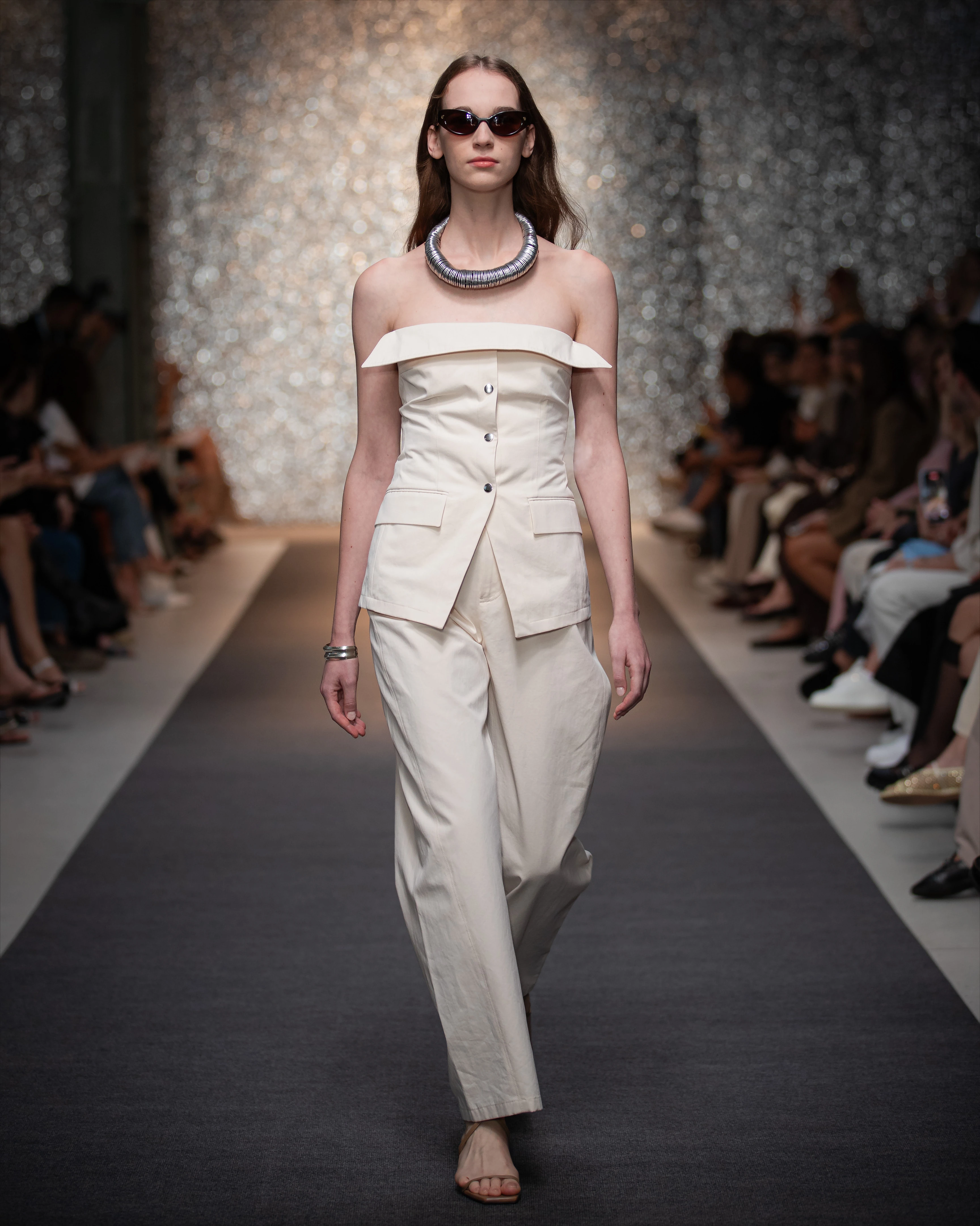 A boleróujjak friss, kifinomult megközelítést adnak az alkalmi viseletnek, és zökkenőmentesen folytatódnak a felsőruházatban is, ezzel kontrasztot teremtve. A szezon kabátjai új rétegekkel és volumenekkel játszanak: a klasszikus khaki trenchcoat valódi A-vonalú struktúrája mellett rövidített, bőrhatású farmerdzsekik és lágyított gyapjúdarabok jelentek meg a kifutón. Ezek könnyedebb és vastagabb verziókban is elérhetők, időtlen, átmeneti darabokat kínálva.