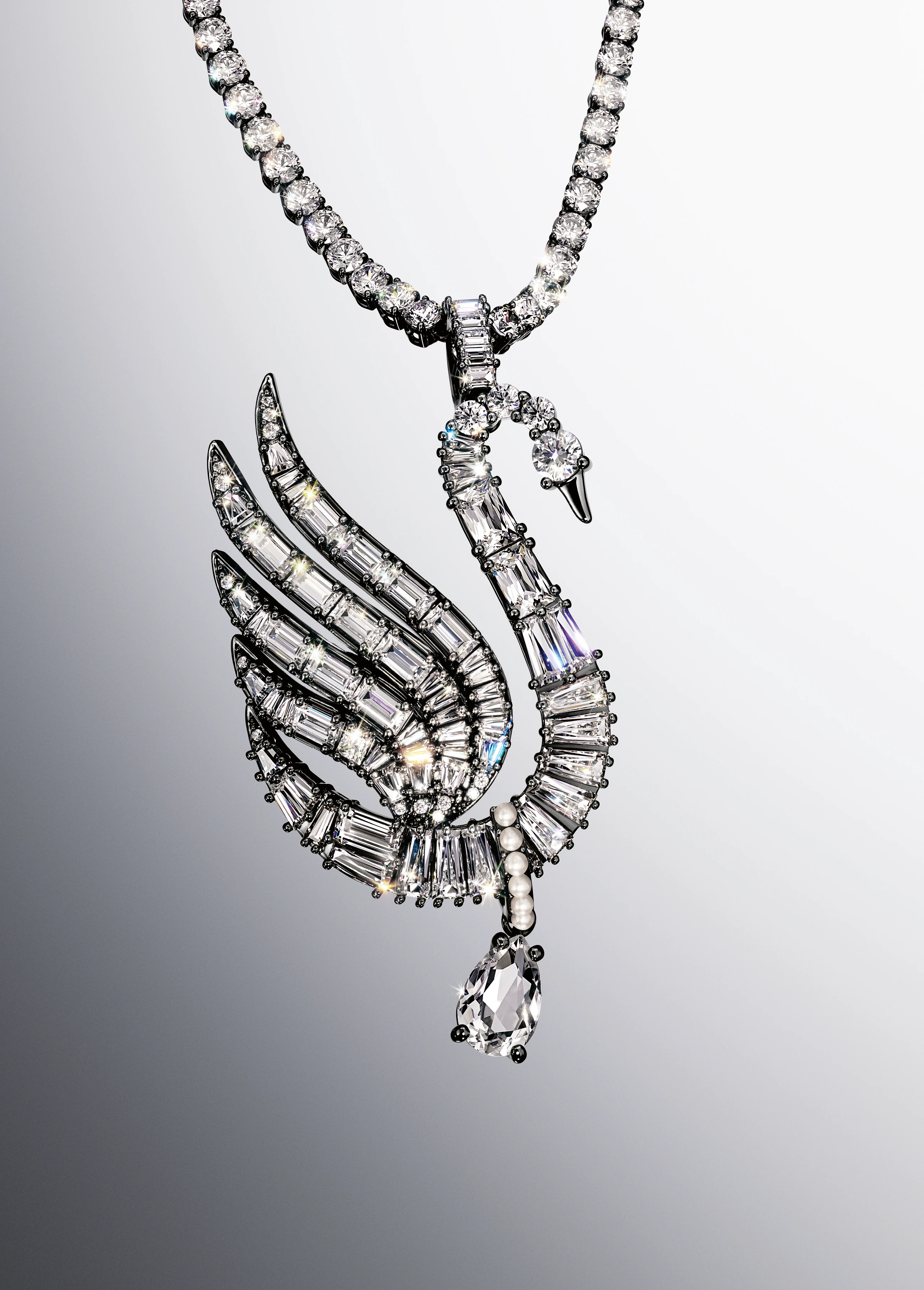 Az absztrakt szárnyak és tollszerű formák szinte dacolnak a gravitációval, dinamikájuk a hattyú kecses mozgásait idézi. A pavé díszítés és a különböző méretű, vegyes csiszolású kövek együttese még ragyogóbbá varázsolja ezeket az ékszereket. Kifogástalan tisztelgés a Swarovski 130 éves kristályművészete és technikai zsenialitása előtt.