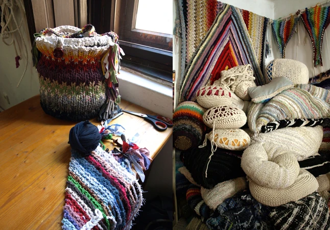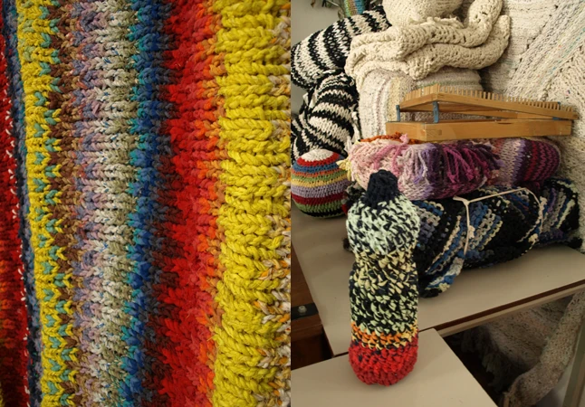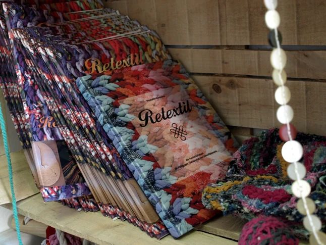 A könnyű instrukciókat követve én is hozzáláttam életem első Retextil fonalának elkészítéséhez, s persze mint kiderült, mindez nem két perc: a három órás foglalkozás alatt két gombolyag fonal bepödréséig jutottam a két behozott felsőmből, és csak belekezdeni maradt időm egy hurkolásos falidíszbe, viszont nagyon motivált a magam körül látott sok, már kész alkotás, ami a végeredménye lehet a dolognak. A falakon körben hatalmas szőnyegek lógnak, melyek akár több hónapig készülhettek, a sarkokban tornyokban állnak a Retextil bútorok, a fonalak stílusos textiltárolókban várják a felhasználást, a polcokon pedig színpompás sapkák, gombnyakláncok, fülbevalók sorakoznak eladásra készen. A cél, hogy innen már semmilyen hulladék ne távozzon, még a fonalból kimaradó varrásokat és az egészen apró darabokat is felhasználják tömőanyagnak a különböző tárgyakhoz. A technikához se vízre, se áramra, se semmilyen kémiai beavatkozásra nincs szükség, így az újrahasznosításnak ez a formája tényleg 100%-ban zöld.