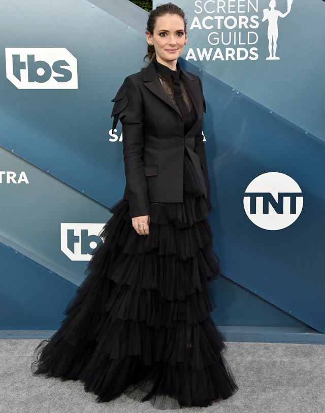 Winona Ryder ritkán kelt túl nagy feltűnést a vörös szőnyegen, pedig hajlamos ugyan kissé komor, csupa fekete szetteket választani, de ezek rendre gyönyörű darabok, mint a SAG gálán viselt Dior összeállítása is, ahol a zakója igazán különleges volt, a tüllruha pedig csodaszép: