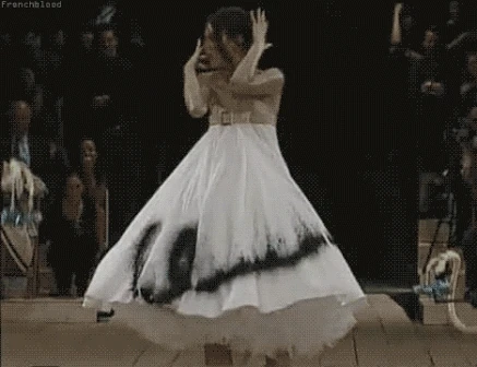 És többször is úgy érezzük, hogy a show elérkezik a csúcspontjára, az elsötétedő teremben a forgó lapokon hihetetlen papírruhákban forognak a modellek. Sokadszorra is felhangzik a taps, de még senki nem tudja, hogy miért áll a fapadlós terem közepén a két festékszóró robotfej, aztán belép Shalom Harlow egy sokrétegű papírruhában.