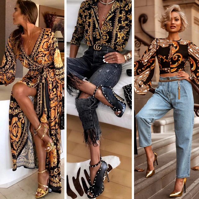 Minták tekintetében idén három nagy favoritot érdemes idén kiemelnünk: a kockákat, a kígyómintát és a fenti képeken látható, barokkos hatású úgynevezett chain printet.