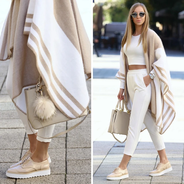 Végül, de nem utolsósorban újra virágkorukat élik a hatalmas kötött sálak, illetve plédre emlékeztető poncsók, pelerinek. Szintén nagy kedvencem ez a mánia, hiszen egyszere trendi és praktikus – ezek a meleg kötött kiegészítők ugyanis különösen jó szolgálatot tesznek a hűvös, őszi reggeleken.