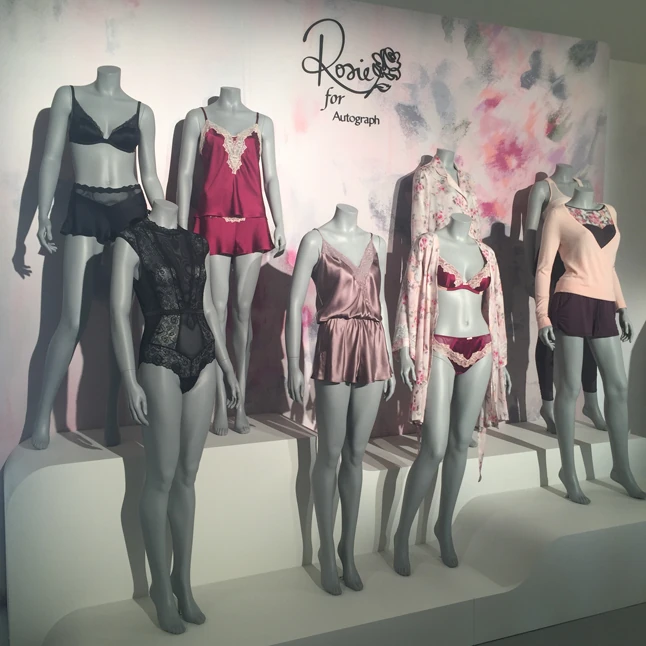 Soozie: Ezt a Rosie-kollekcióra jellemző nőies, romantikus vonalat folytatjuk, hiszen egy fehérnemű-kollekció nem lenne teljes ezek nélkül a darabok nélkül. 2012 óta, mióta létezik a Rosie Huntington-Whiteley által reklámozott és a színésznővel együtt tervezett kollekció, a vásárlóink amiatt keresik, mert végtelenül nőies, és benne van Rosie csillapíthatatlan vonzódása a vintázs holmik iránt. Mindig találsz ebben a kollekcióban csodás selyemből készült melltartókat, mesés csipkéket, franciás könnyedséggel megspékelt darabokat. A 20-as 30-as évek világát idézzük fel, Rosie imádja ezt a púderes budoárokat idéző időszakot. Valahogy ezzel a fő csapással kapcsolatban is szerettünk bele annyira a csipkébe, ez az alapanyag alapvetően meghatározza a kínálatunkat. Ebben a szezonban a balett világa volt egyébként a fő inspirációnk, ezt már a meghatározó színekben is érzékelni lehet, hiszen a klasszikus balettcipő fényes rózsaszín szaténja lebegett a szemünk előtt, amikor alkottunk. A klasszikus, romantikus virágminták olyanok a textíliákon, mintha mozgás közben látnánk őket, elmosódottak, foltszerűek. Fontos, hogy egészen G-kosárig kínáljuk ezt a kollekciót, így mindenki talál magának megfelelő méretű, kényelmes, finom anyagból készült melltartót. Van egy sportosabb vonala is a Rosie for Autograph-nak, amik szintén a táncórákat idézik. A sportmelltartókat viselheted edzésre, de akár hétköznap is, mert nagyon finom anyagból készülnek. Sokszor azt vettük észre, hogy a nők szívesen viselnék ezeket a sportos darabokat akár minden nap. Erre az igényre sok-sok választ adunk ezen a tavaszon. Nyugodtan rajtad maradhat a sportmelltartó akár egész nap!