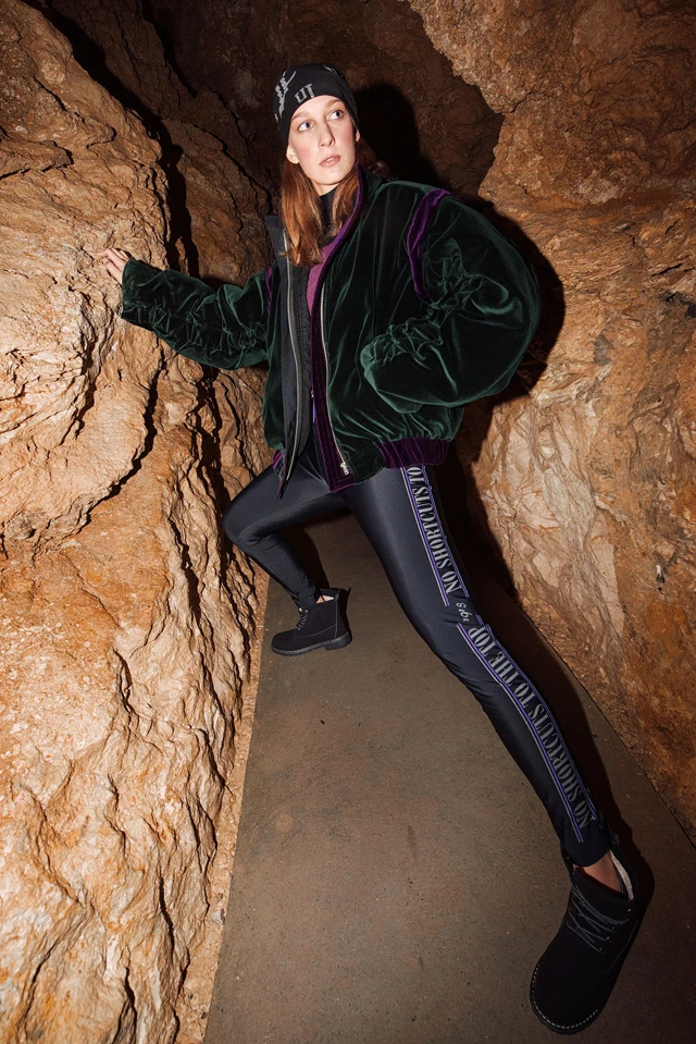 Először is megvizsgáltam a millennial generáció szokásait. Főként a sportos és a streetwear darabok beépítése jellemző az öltözködésükre. Így már tudtam, hogy milyen ruhadarabokat szeretnék tervezni. Utána már csak az volt a kérdés, hogy mi legyen az inspirációm. Végül úgy döntöttem, hogy az első hegymászónőkkel fogok foglalkozni. Ők 1850 és 1920 között éltek. Megnéztem, hogy mit alkottak és mi volt bennük a közös: mindegyikőjük kommunikálni akarta, hogy mit vitt véghez és a korabeli nőjogi mozgalmakhoz is kivétel nélkül kötődtek. Könyveik címe, idézeteik jelennek meg az egyes ruhadarabokon. Szerettem volna, ezzel a kollekcióval tudatni, hogy kik is voltak ők, akik hozzájárultak a nők mai társadalmi megítéléséhez, és mondjuk, ha ma élnének, miben képzelném el őket. A szüfrazsett mozgalom arculati színeit használtam: lilát és zöldet, amit feketével egészítettem ki. A bársony szintén ezt a kort idézi, amit funkcionális anyagokkal kombináltam, ezzel egy izgalmas ellentétet létrehozva.