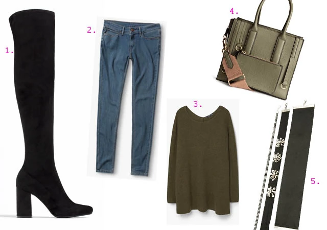 1. Csizma: ZARA 17 995 Ft - 2. Farmer: Levi´s 20 990 Ft - 3. Pulóver: MANGO 5995 Ft - 4. Táska: H&M 9990 Ft - 5. Choker, nyakláncszett: STRADIVARIUS 2995 Ft