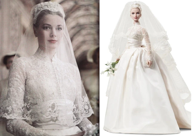 Az elefántcsont színű selyemszoknyának három csipke alsószoknya adott tartást, a magasan záródó nyakú, testhez álló felsőrészt pedig brüsszeli csipke és gyöngyök díszítették. Ez a menyasszonyi ruha szerepel a Grace Kelly tiszteletére készült, 3 különféle öltözékű, limitált szériás, 2011-es Barbie baba sorozatban is.