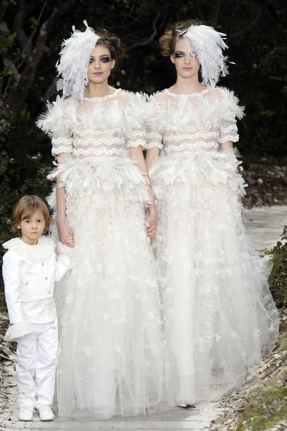 A keddi haute couture divatbemutatón két menyasszonynak öltözött, inkább nemtelenre maszkírozott modell vonult a Chanel kifutóján, oldalukon az amerikai filmekben elmaradhatatlan gyerekkel. Kati Nescher és Ashleigh Good modellek mellett Lagerfeld egykori kedvenc férfi modelljének, Brad Kroenignek a kisfia vonult, nem először végig a divatház kifutóján.