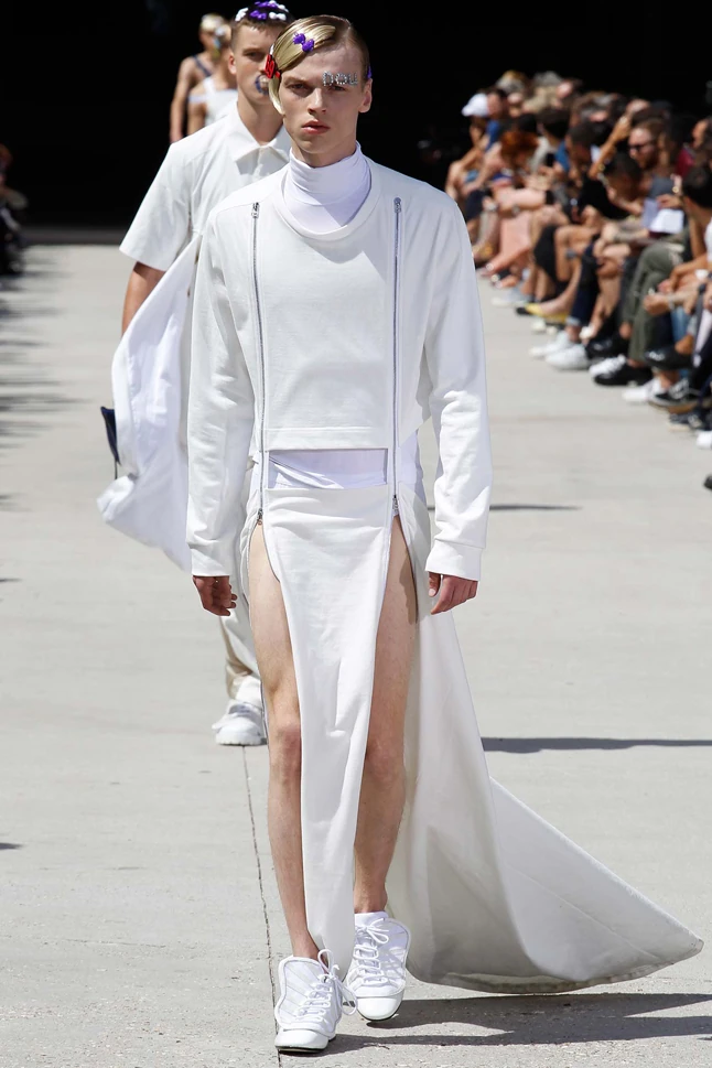 Shayne Oliver, a Hood by Air divattervezője szintén megdöbbentő kollekcióval készült az idei divathétre. A babycore trendre épülő, nemi kérdéseket feszegető show a Galvanize nevet kapta, és Oliver gyermeki csillogásként emlegette egy interjúban. A férfimodellek maxiszoknyát, félvállas felsőt, és egyéb trendi női ruhákat viseltek, arcukon flitteres játék felirattal, hajcsatokkal, és egy meglehetősen abszurd, oldalra fordított műfogsorral. Nos, Oliver show-ja tökéletesen beleillett a Pride hangulatába, és újabb löketet adott a szexuális szabadság hírvivői számára.