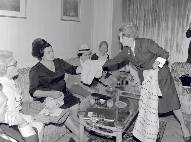 Éberné Donáth Bora, Borika, a szalon legendás dierktrisze mutat ruhaanyagokat Jovanka Titonak, Jugoszlávia elnöke, Josip Broz Tito feleségének, a Váci utca 12. szám alatti szalonban. Jobbján Rotschild Klára, balján Kádár Jánosnak, az MSZMP főtitkárának felesége, a stüszi kalapjairól és puritán drapp-bézs-sötétkék Rotschild kosztümjeiről elhíresült Tamáska Mária ül. Titóné a szalon legillusztrisabb kliensei közé tartozott. Méretre állítható próbabája lehetővé tette, hogy a szalon szabászgárdája napra készen követhesse az asszony hízását és annak megfelelően adaptálja a kelet Kennedynéjének új ruhatárát. Budapest, 1974. április 27.