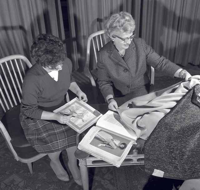 Rotschild Klára anyagot választ, Bein Klára, az Iparművészeti Főiskola fiatal ruhatervező iparművész növendéke, aki a szalon ösztöndíjasaként vett részt a munkafolyamatokban nyugati divatlap alapján modellt rajzol. A képen az a fázis látható, amikor a budapesti divatház modell albuma számára a párizsi nagyházak divatbemutatóin élőben látott, majd megvásárolt egy-két snitt, illetve a kinti rajzolók által lemásolt modellek mellé a divatlapokból is választanak ruhakát és adaptálják a szalon modellkínálatába. 1962. január