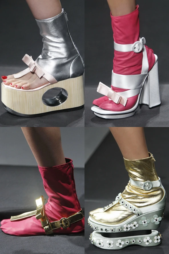 Ezek tényleg Prada cipők. A japán nők nagy napja virrad fel, amikor a kifutón megjelentek ezek az őrült lábbelik. Nem vitás, hogy a japánok még több Prada papírtáskával távoznak majd az üzletekből. De hogy mi mit kezdünk ezzel a trenddel, az még kérdés. Axente Vanessa is végig tudott bennük menni a kifutón, tehát a dolog nem lehetetlen.