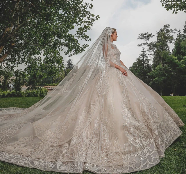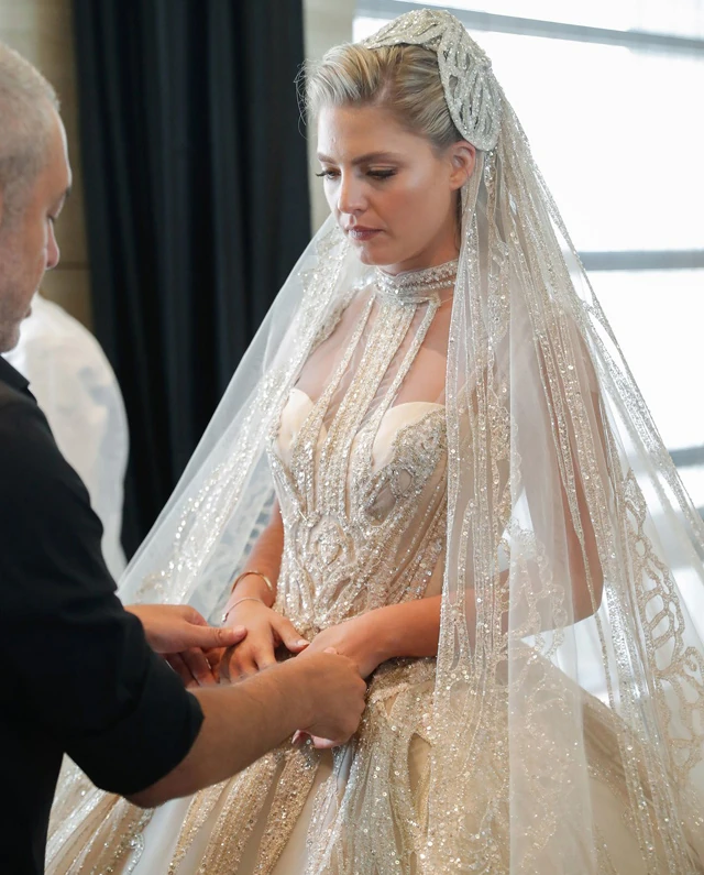 Természetesen a különleges, és teljesen egyedi esküvői ruhát Elie Saab készítette a fia menyasszonyának. De olyan ruhát, hogy attól eláll a lélegzetünk. A mesés, óriási uszályos ruha tele van szórva csillogó kristályokkal, amit hagyományos libanoni motívumokat idéző díszítésben rendeződnek el a ruhán. Nem kevesebb 12 ember összesen 450 órányi munkája volt a menyasszonyi ruhában, ami természetesen nem az egyetlen volt, amit a menyasszony viselt.