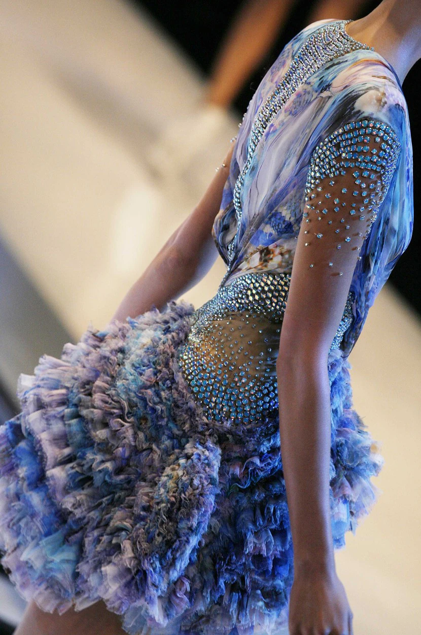 A csípő és váll szabása a kulcs a kollekcióban, és a divattervező egészen páratlan virtuozitással kombinálja a különféle megoldásokat, az anyagokat. Egészen extrém hatást tud elérni, néhány darabot, mint teknős a páncélját viselik a modellek, más alkalommal szinte második bőrként simul rájuk a ruha, ami észrevétlenül deformálja az alakot. A ránézésre szinte homogén kollekció egyes darabjai hemzsegnek a bravúros megoldásoktól, hol fodrozódó hullámot álmodik McQueen a modelljére, hol pedig egy váratlan ujjszabással valóságos szelíd vízi szörnnyé változtatja a ruha viselőjét.