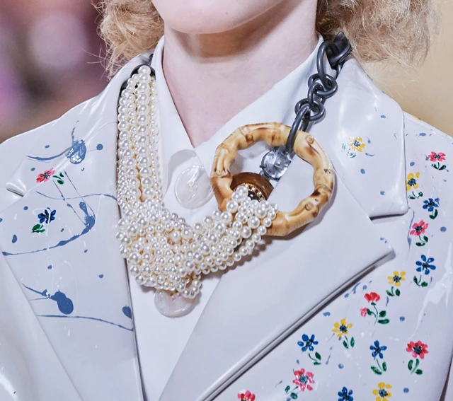 A Vogue főszerkesztője egyértelműen arra számít, hogy az utóbbi időben előre törő gyöngy ékszerek népszerűsége tovább növekszik. Ha rá hallgatsz, akkor olyan nyakláncot veszel, ami gyönggyel kombinált. Ennél a trendnél is fontos, hogy a gyöngy kombinálható, és remekül megfér nemesfémekkel éppúgy, mint kötélvászonnal, ahogy azt a Miu Miu kifutóján is láthattuk. Minél különlegesebb a kombináció, annál izgalmasabb lesz ez a trend.