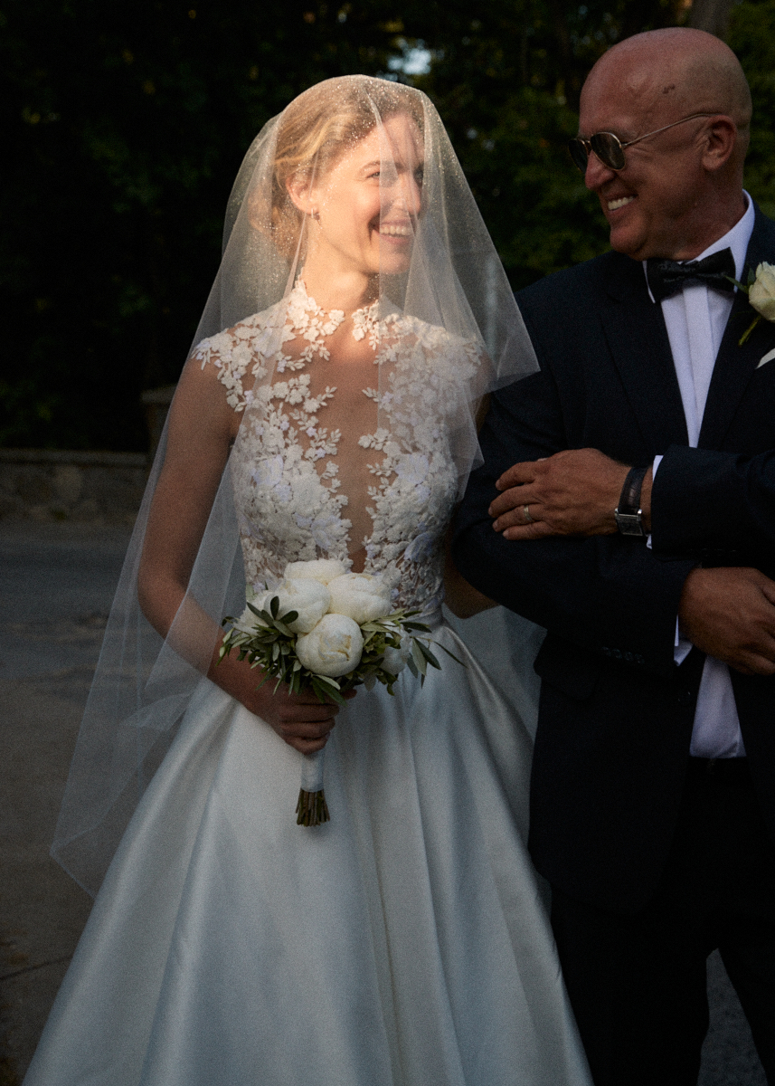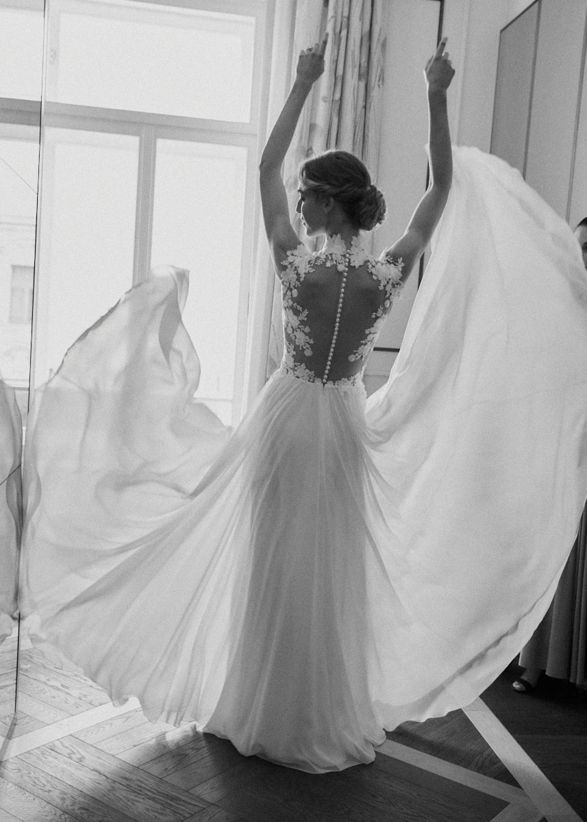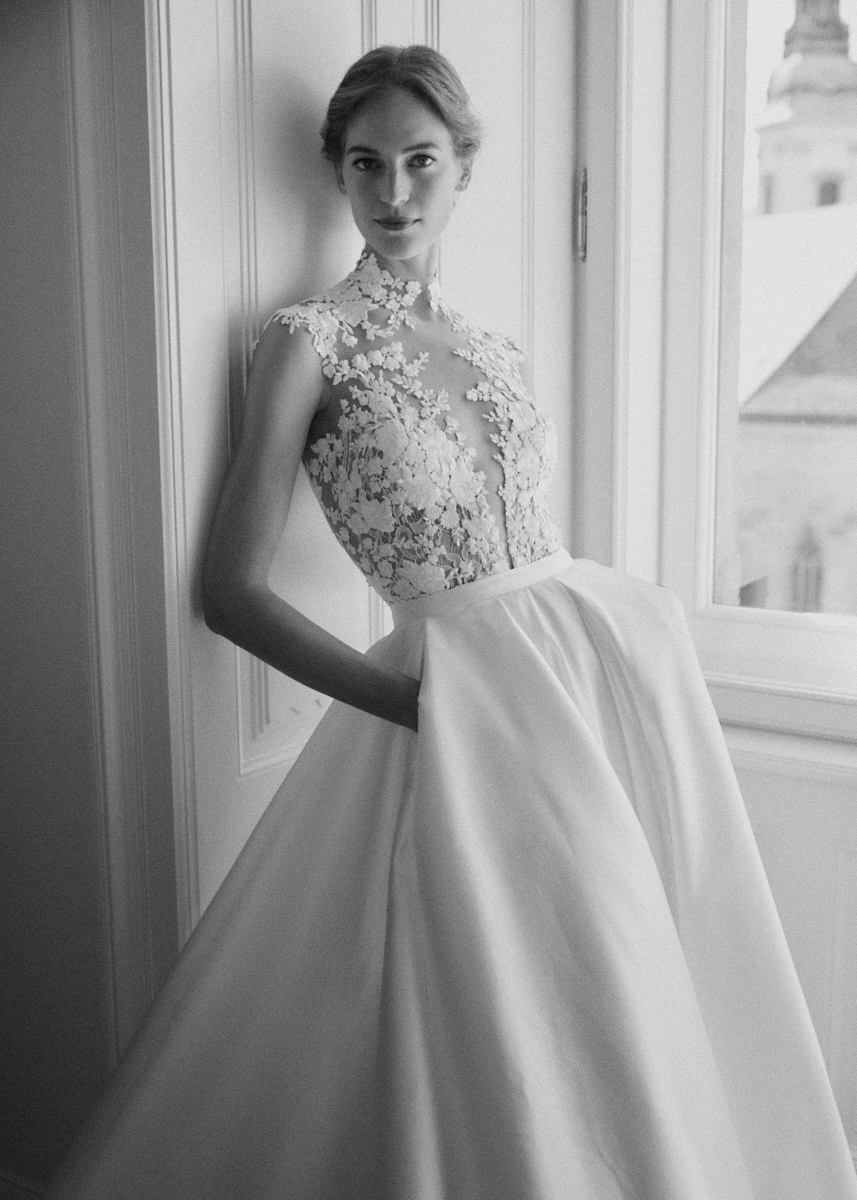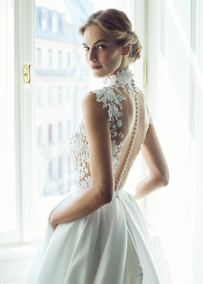 „A legfontosabb szempontom az volt, hogy ne az esküvői ruha uralkodjon rajta, hanem mindenki arra figyeljen, ő milyen gyönyörű, és minden egyes részlet a ruhán az ő szépségét erősítse. Vanessának természetesen bármilyen stílusú ruha jól áll, de a tervezés során igyekeztük kiemelni a legszebb tulajdonságait, például a gyönyörű, hosszú karját és az elegáns nyakát. Hogy jobban kihangsúlyozzuk ezeket a részeket, kicsit eljátszottam a ruha felsőrészével, így a csipke le tudott kúszni a vállain, és követhette a nyaka ívét is. A felsőrészhez az egyik ikonikus csipkénket választottuk. A teljes felsőrész kézzel van varrva, minden egyes csipkevirágot kézzel applikált rá a Daalarna csapat. A kettő az egyben szoknyarésszel pedig azt szerettük volna elérni, hogy a szertartáson meglegyen a hercegnős hangulat a nagy szoknyával és az uszállyal, amit utána néhány mozdulattal egy könnyed és légiesebb szoknyára tudjon lecserélni Vanessa, hogy egész este kényelmesen táncolhasson benne."