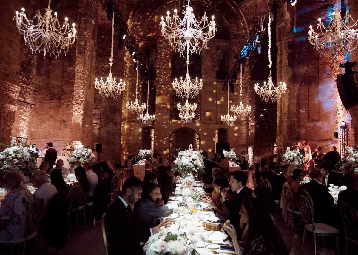 Eredetileg a Vajdahunyad Vár volt a terv, de mikor tavaly újra elkezdtük szervezni az esküvőt, már nem tudtuk megoldani, hogy ott legyen. Úgy gondolom, hogy a Kiscelli Múzeum végül sokkal jobb választás volt. Be kell vallanom, hogy elsőre ijesztő volt számomra, mert nem tartottam olyan romantikus helyszínnek, de amikor megláttam a belső udvarát a szobrokkal, tudtam, hogy tökéletes lesz, főleg úgy, hogy a ceremóniát a szabadban tudjuk így tartani, ami fontos volt számomra, a vacsorát pedig a templomtérben annak ellenére, hogy egy teljesen szokatlan választás volt. A vendégek is nagyon elégedettek voltak és a dekor még rátett egy nagy adaggal a wow-effektusra. Képeket vetítettünk a falra, csillárokat lógattunk be, nagyon egyedi és csodás teremmé varázsoltuk a helyszínt, de mindenképpen meg akartuk tartani a régies hangulatát.