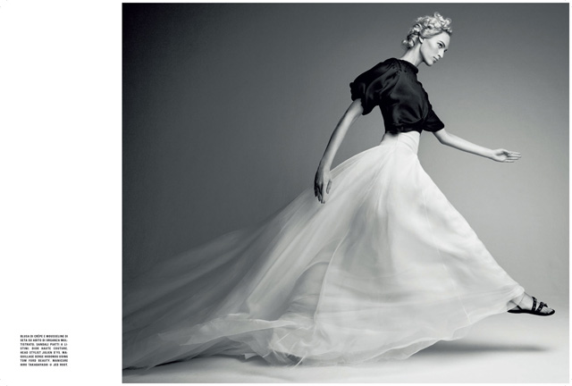 Azt már régóta tudjuk, hogy az amerikai és az olasz Vogue magazinok kézről-kézre adják, hol az egyik, hol a másik kiadásban bukkanik fel a szőkeség. Most éppen az olasz verzióban láthatjuk, ahol újabb igencsak nagy megtiszteltetés érte, hiszen a haute couture melléklet modellje lett. Ezúttal is egy divatfotós nagyágyúval, Patrick Demarchelier-vel dolgozott együtt.