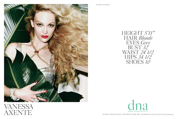 Muszáj volt ekkora felvezetőt írnom, hiszen magyar divatikonunk Anna Wintourral való megismerkedése után, illetve miután a legfontosabb modellekkel foglalkozó honlap, a Models.com 11. helyezettnek hozta ki maga mögé utasítva ezzel a legnagyobb favoritokat, újabb fontos mérföldkőhöz érkezett: Vanessa Axente (Attractive) Patrick Demarchelier portréján foglalta el méltó helyét a `The New Breed` csoportban, többek közt Caroline Brasch Nielsen, Sasha Luss, Fei Fei Sun, Ondria Hardin és Maud Welzen mellett, melyhez a világ egyik legbefolyásosabb stylistja, Karl Templer asszisztált. Ezzel visszavonhatatlanul bekerült a high fashion modellek azon körébe, akikről a jövőben még várandósságukról is külön fotósorozat készül valamelyik nagy divatmagazinba.