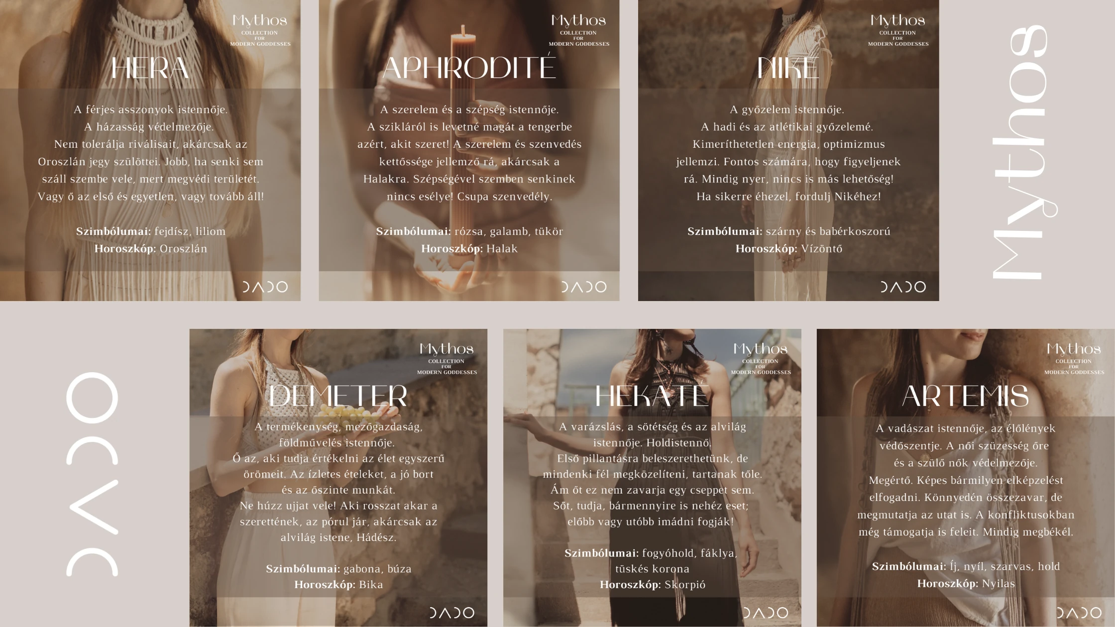 A MYTHOS egy olyan makramé ruha és kiegészítő kollekció, melyben a termékeket a görög istennők, azok karakteressége, egyedisége, különböző egyénisége, személyiségjegye, ereje ihlette. A ruhák színezete, jellege utal az istennők tulajdonságáira, akár szimbólumaikra és üzen a mai modern nőknek. Felszabadultabb "én"-re inspirálnak.