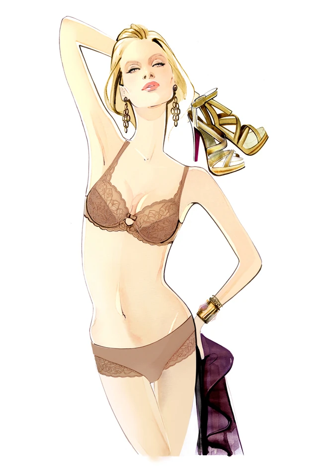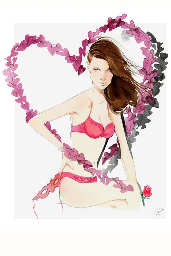 Az első illusztráció a Valentin napi kollekció előtt tiszteleg, ahol a nőalak éppen egy romantikus randevúra készül, a Heart& Flower Valentin napi szériájában, melyet egy pajkos csipke szemmaszk tesz izgalmassá.