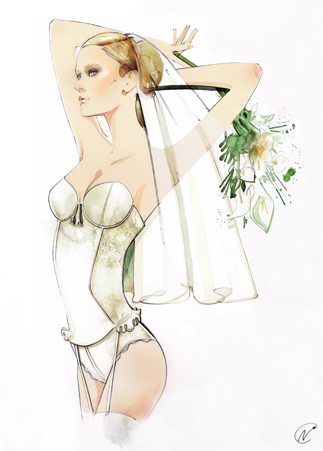 Az esküvői szezonra készült alkotáson éppen egy mennyasszony készülődik élete legfontosabb napjára, tökéletesen szabott, elefántcsont színű fűzőben és harisnyatartóban.