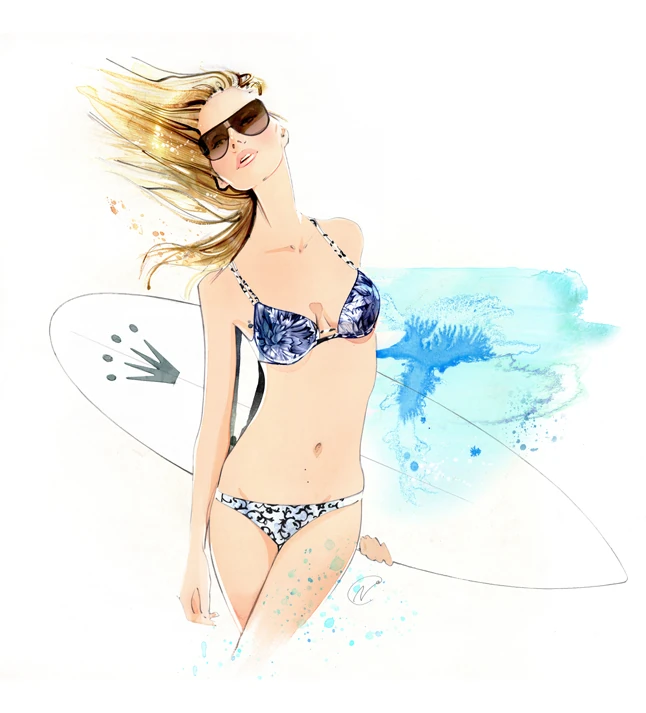 A nyár előszeleként mutatjuk be a "Triumph Swim" illusztrációt. A szexi nőalak, virágos bikiniben vidám, nyári hangulatot sugároz a tengerparton, szikrázó napsütésben, szörfdeszkájával a kezében.