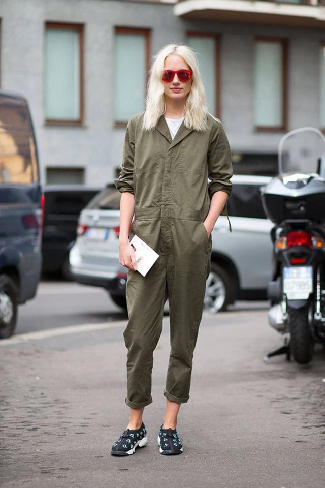 Az aktuális kedvenc ezúttal a cargo jumpsuit, azaz az egyenruhaszerű kezeslábas. Lehet rövid, és hosszúujjú is, a lényeg, hogy mindig legyen kigombolva, a szára picit felhajtva.
