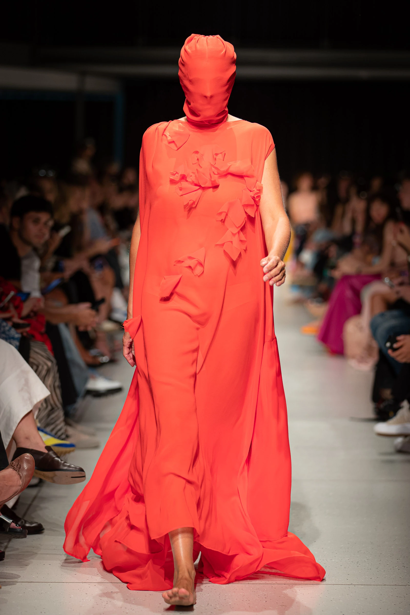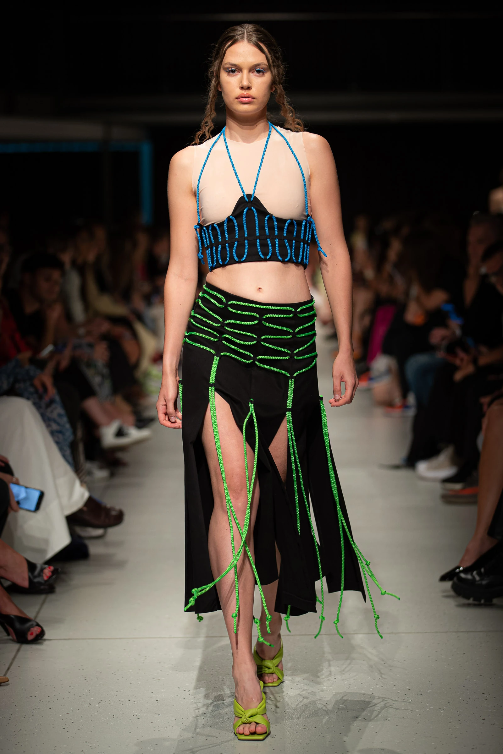 Tereza Rosalie Kladosova szenvedélye a vizuális történetmesélés, és ez vibráló, játékos kollekcióján is meglátszott. A Siren's song, vagyis a Szirén dala nevet viselő kollekció fő motívuma a spirál volt, amely egyszerre utalt az élet kezdetére és a kagylók formájára, miközben a kötél- és fémdarabok az óceán mélyén elveszett tárgyakat szimbolizálták. A divattervező környezettudatos munkája során deadstock anyagokkal dolgozik, limitált számban elérhető kollekcióinak többsége pedig kézzel készül.