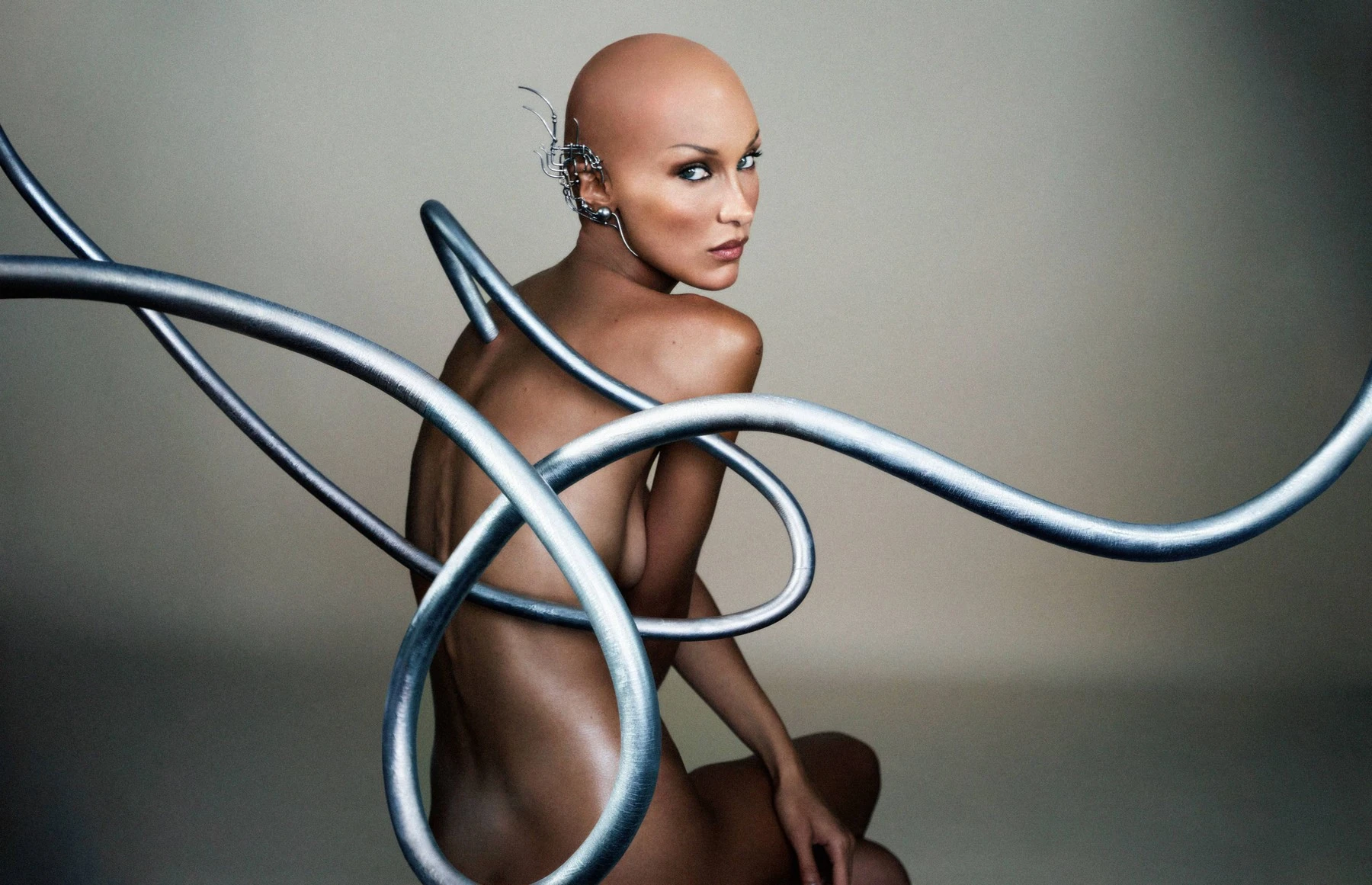 Bella Hadid a Marc Jacobs márka ikonikus Kiki csizmájában pózol, miközben a haja különböző formákban és árnyalatokban játszik. Valljuk be, hogy a legmegdöbbentőbb a teljesen kopasz megjelenés, de a lehető legjobb értelemben: a modell még így is álomszép. A következő a képen a modell csak a Network ezüst fülbevalót viseli, miközben egy hosszú ezüst csáp áll ki a gerincéből.