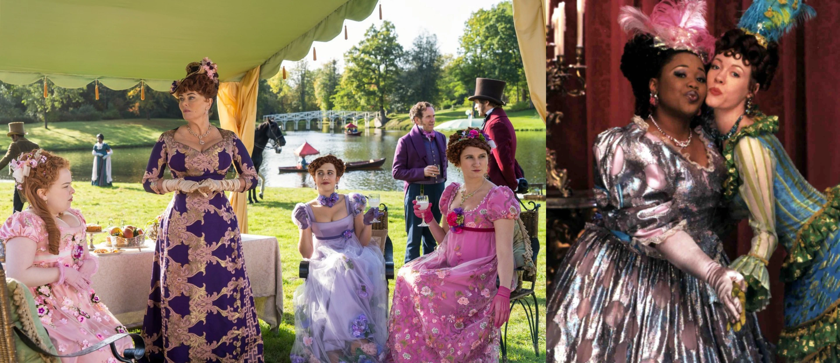 A Bridgerton családban szereplő Featherington hölgyek narancssárga, lila színű ruhákat viseltek, amelyek az élénkséget, vidámságot és magasabb rangot szimbolizálták. Azonban a személyiségüket is tükrözték a kosztümök.