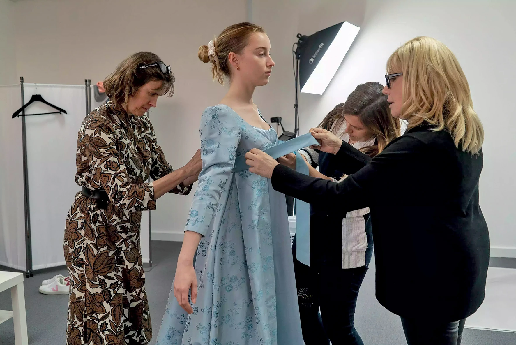 Canale is említi ezt a különleges lehetőséget, hogy megalkossa a szereplőket. „Leírod egy lapra, aztán a showrunnerrel, a rendezővel, majd a színészekkel közösen egy csodálatos együttműködés keretében megalkotsz egy új karaktert, aki azelőtt nem létezett és aki most belép a világba.” Az a pillanat, amikor egy színész először felpróbálja a jelmezét, elképesztő! „Látod, ahogy valaki konkrétan átváltozik, a karakterévé válik. Megváltozik a tartásuk, másmilyenek lesznek a kézmozdulataik.” Amikor felveszik a kesztyűt, az általában egy „kulcsfontosságú pillanat”. A színésznő Ruth Gemmell, aki Lady Bridgertont alakítja, elárulja nekem, hogy „a fűzők szorossága azt jelenti, hogy más módszereket kell találni a megpihenésre. A báliruhák súlya pedig a komolyság érzését adja. Amikor belépsz ezekbe a jelenetekbe, tényleg azt érzed, hogy mindent meg tudsz csinálni.”