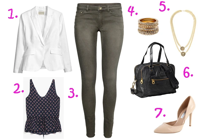 1: blézer, H&M, 9900 FT, 2: felső, Zara, 9795 FT, 3: farmer, H&M, 5990 FT 4: Karkötő, Bershka, 1795 FT 5: nyaklánc, Parfois, 2695 FT 6: táska, Pepe Jeans, 49 500 FT 7: cipő, F&F, 5990 FT