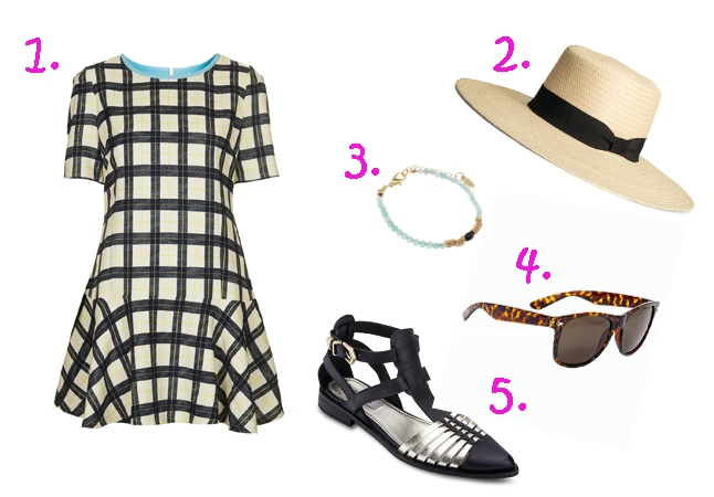 1: Kockás ruha: Topshop, 55 font, 2: Szalmakalap: H&M, 3990 FT, 3: Karkötő: Parfois, 1490 FT, 4: Napszemüveg: F&F, 1790 FT, 5: Szandál: Pepe Jeans, 20 290 FT
