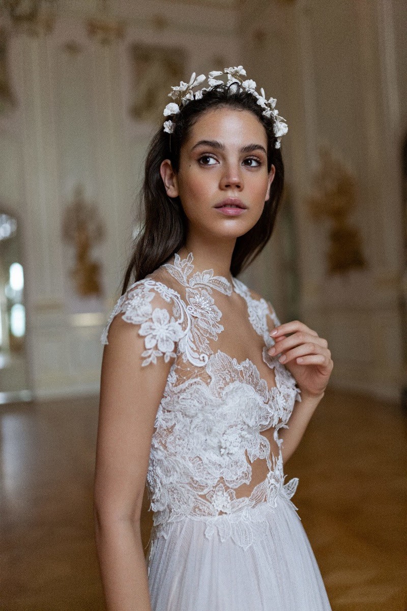 A csipkedíszítések meghatározó motívumai a különféle indák, levelek, girlandok és háromdimenziós megoldások. Ez a különleges motívumvilág ihlette a limoges-i porcelánból készült fejdíszeket is, amelyeket Nagy Adrien, a Rienne Bride ékszertervezője álmodott meg a kollekcióhoz.