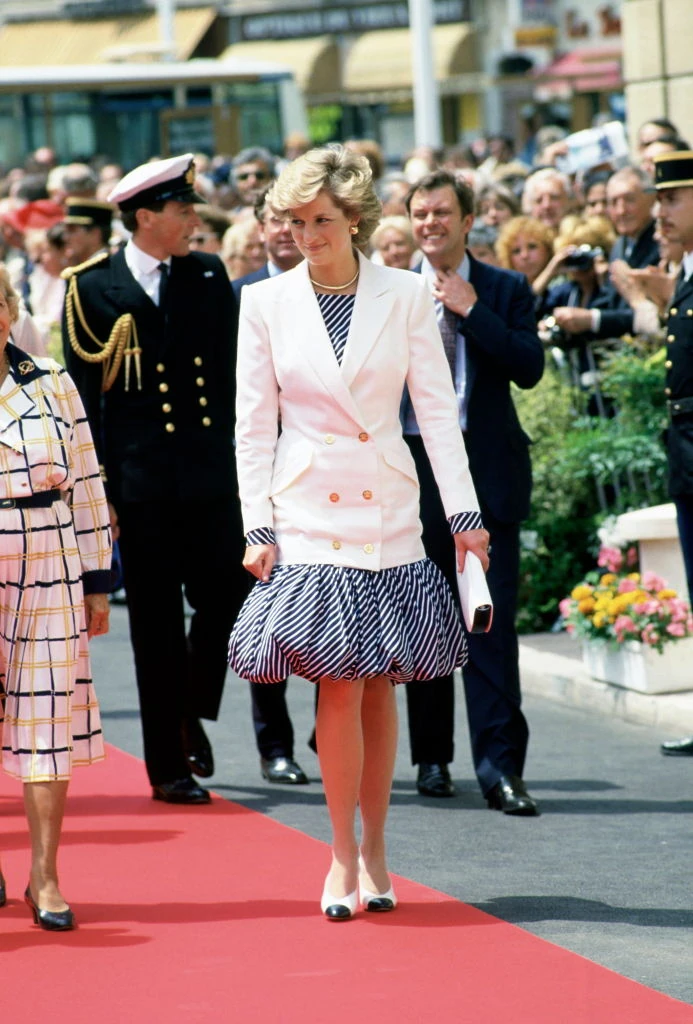 De ugyanazon a napon egy másik gyönyörű szettben is feltűnt a fesztiválon, amiről jóval kevesebb szó esett. Ezt a ruhát is kedvenc tervezője, Catherine Walker álmodta meg, azonban stílusában merőben eltér a púderkék estélyitől. A válltöméses hófehér blézer és a csíkos, puffos szoknya tökéletesen visszatükrözte a '80-as évek power dressing trendjét és a francia riviéra hangulatát.