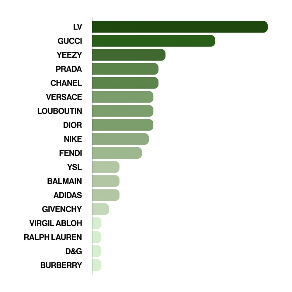 Mindezeket figyelembe véve annyira nem is meglepő a Louis Vuitton egyértelmű első helye. A második legnépszerűbb márka Kanye West dalaiban 24 említéssel nem más, mint a Gucci, ezt követően azonban jelentősen le van szakadva a Yeezy márka, ami ugyan a harmadik legsűrűbben emlegetett brand, de a rapper saját divatbirodalma már csak 9 említéssel büszkélkedhet. Ezt követően olyan ikonikus márkák következnek, mint a Prada, a Chanel, a Versace, a Dior vagy a Louboutin. A többi divatcég csak egy-két említésre érdemes Kanye West dalaiban.