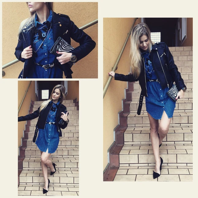 Ha egy partira szól a meghívónk, elengedhetjük a fantáziánkat. Fanni egy igazán vagány szettet állított össze, farmer mini ruhát kombinált bőrdzsekivel, amellyel soha nem lőhetünk mellé. Az összeállítást zebramintás borítéktáskával és feltűnő kiegészítőkkel dobta fel.