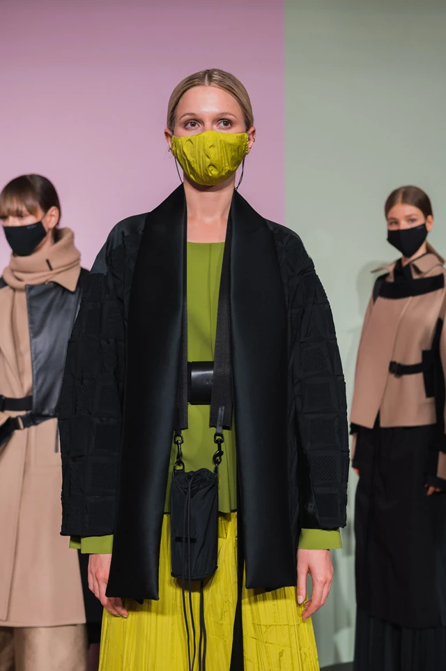 A designerek a fenntarthatóság jegyében egyre több innovatív textilt alkalmaznak, ilyen az újrahasznosított moher gyapjúból készült szőrme és újrahasznosított poliészter orkán. A kollekcióban az anyagok mintázata plasztikaként jelenik meg, a szabásvonalak egymásra rétegezéséből, egyfajta térbeli játék születik. A most bemutatott kollekcióban két irány ötvöződik: a tiszta minimál és a hanyag elegancia, amely irányok a formában és az egyes anyagok eldolgozásában is visszaköszönnek.