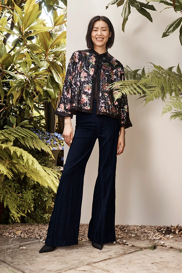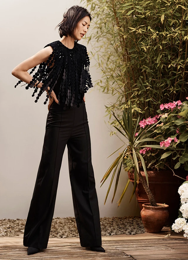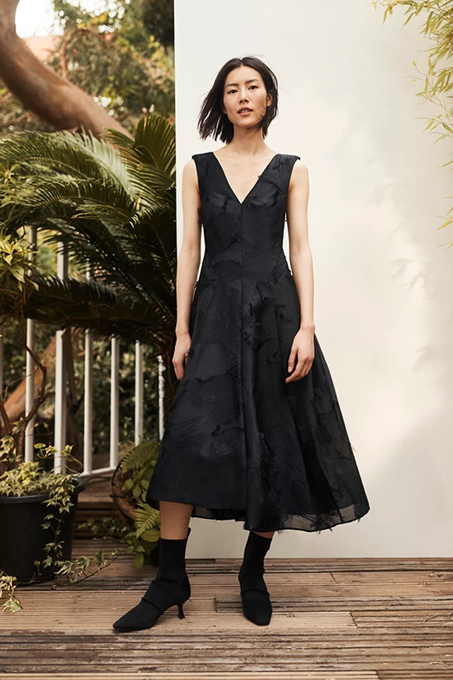 A kollekció kulcsdarabjai között szerepel a derékig felsliccelt földig érő fekete kabát, túlméretezett gallérral, amely újrahasznosított gyapjúkeverékből készült, egy flitteres virágmintás kabát, amely újrahasznosított PET palackokból készült, illetve a hosszú, mintás ruha bő ujjakkal, mély V-kivágással a hátán, amely 100%-ig organikus selyemből készült. Ezek a darabok biztosan magukra vonzzák majd a tekinteteket.
