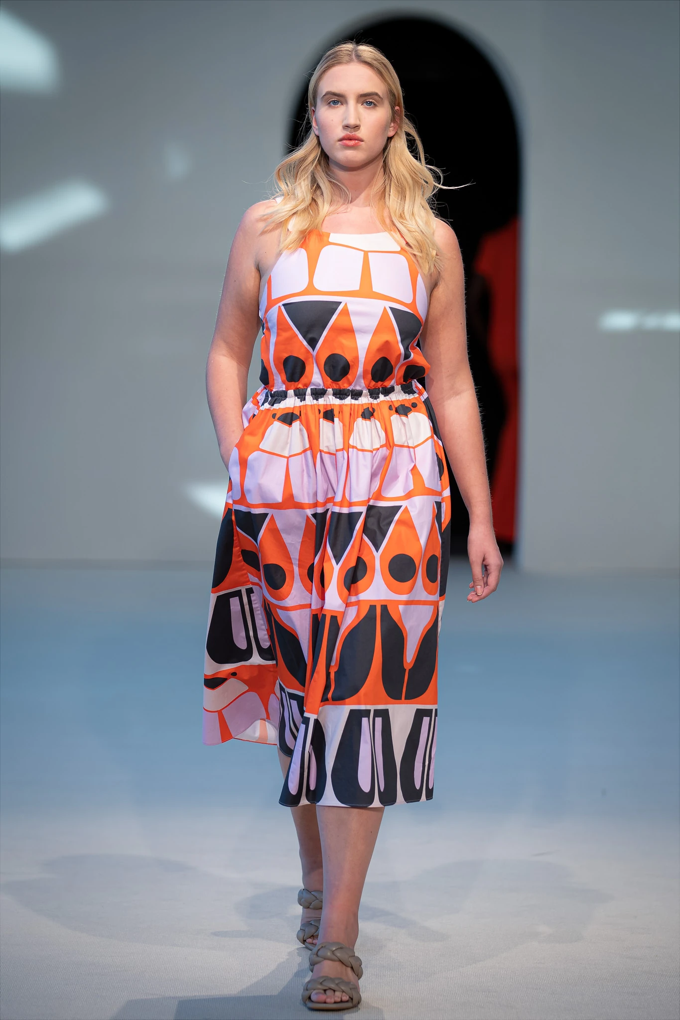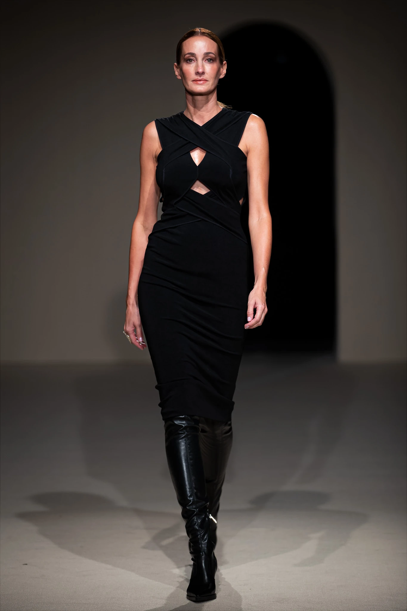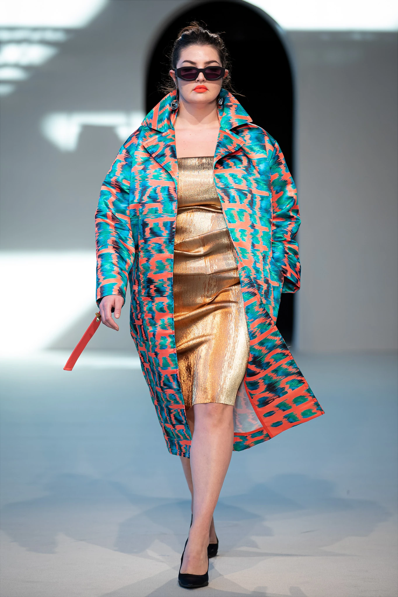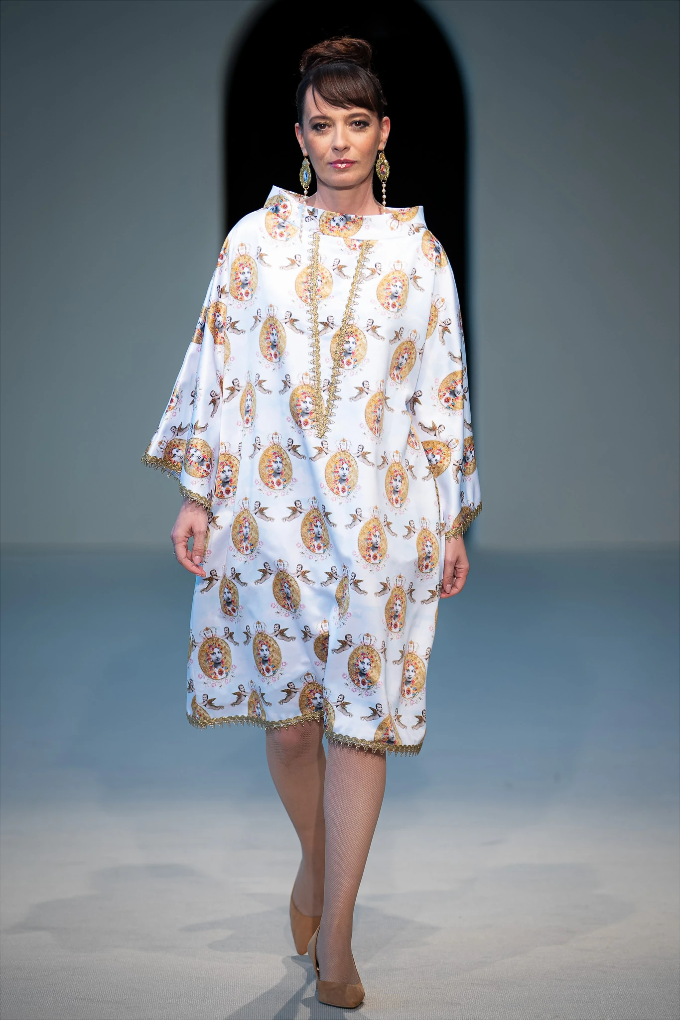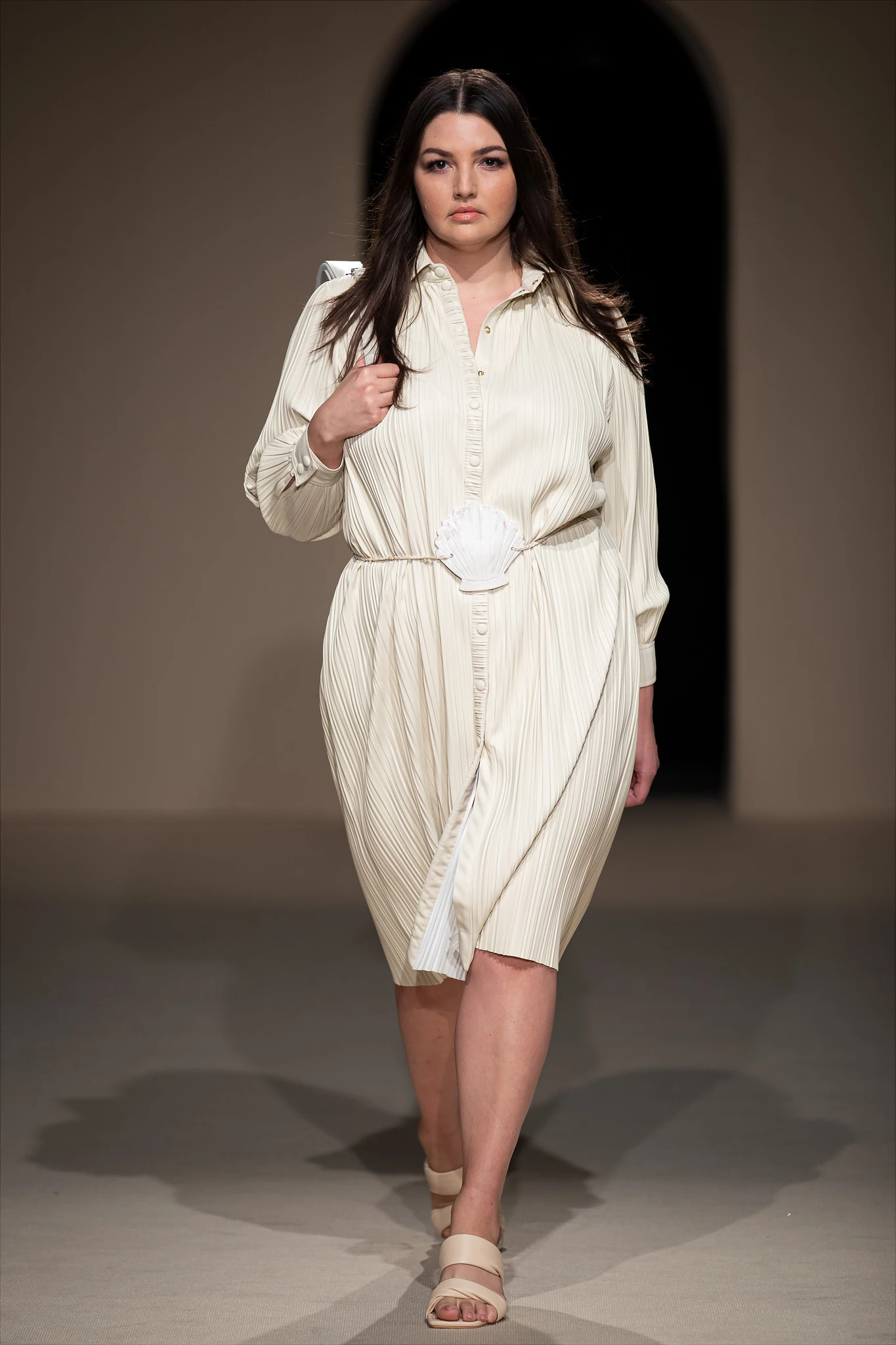 A The Four tervezői, Gálvölgyi Anett és Miovác Márton a kollekció egyik leglátványosabb darabját küldte a kifutóra egy kerekded modellen. A márkára jellemző széles vállvonalak minden formájú és méretű nőn jól állnak és nagyon pozitív, hogy nem a sztreccs feketében, hanem csillogó alapanyagban és erőteljes textilmintájú darabokban képzelik el a 42-es feletti méretű nőket. Kollekciójuk azt üzeni: nem rejtőzködni kell, hanem magabiztosan viselni a testünket, ami folyamatosan változik az életünk során.