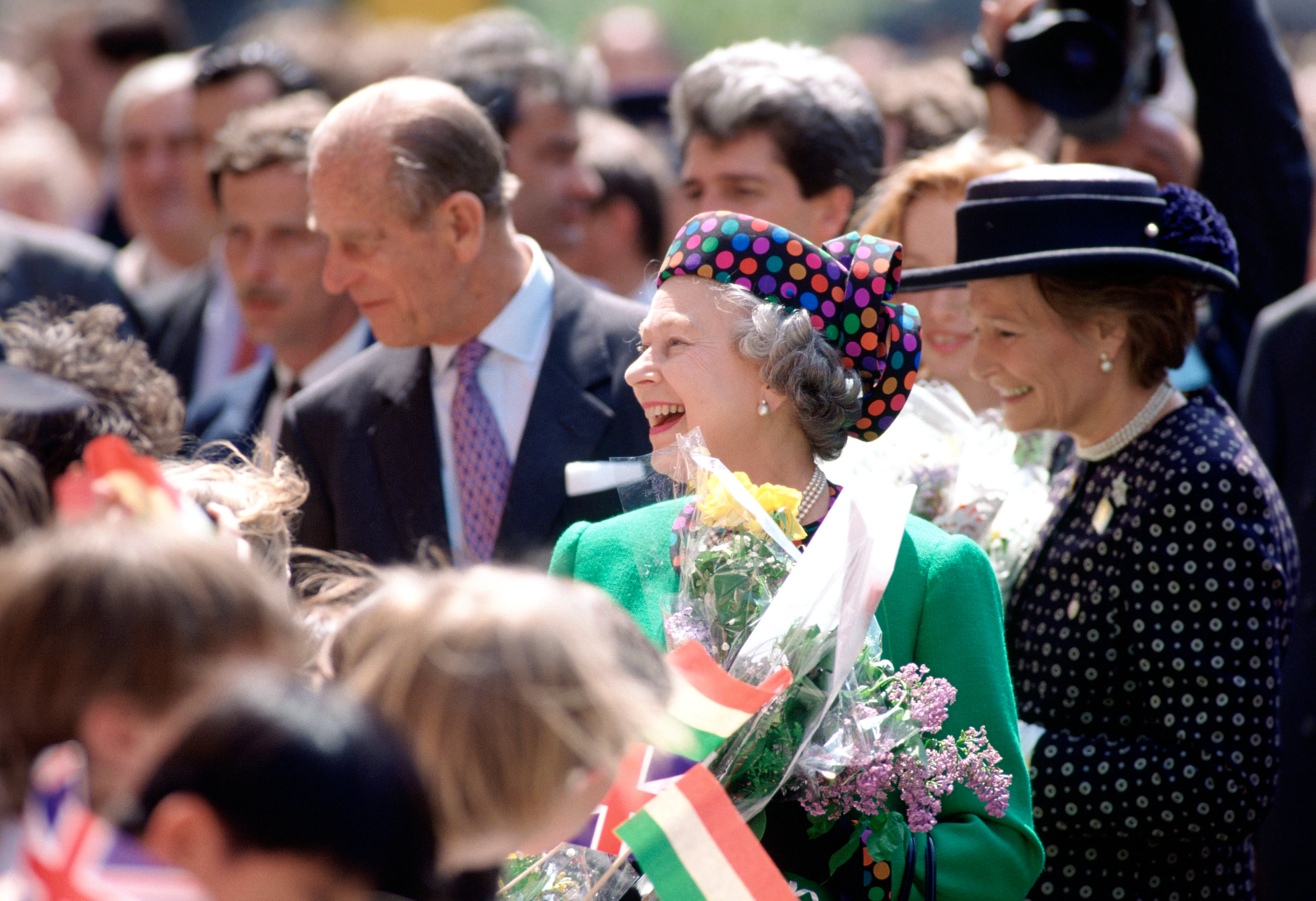 Erzsébet királynő, férjével, Fülöp herceggel, magyarországi útjukon. A királynő színes pöttyös kalapot visel, amelyet Milliner Marie O'regan készített az eseményre.